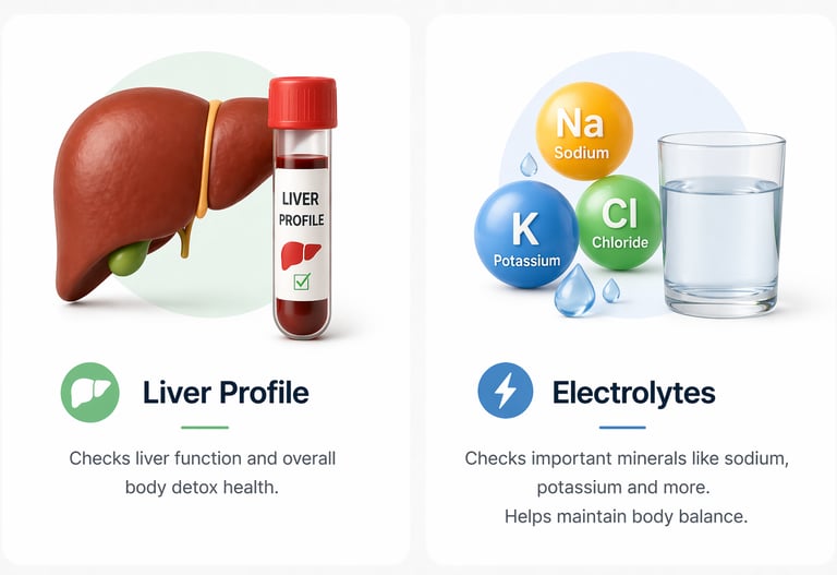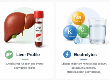 Electrolytes test checks sodium, potassium and body salts. These are important for heart, muscles and hydration balance.