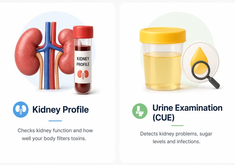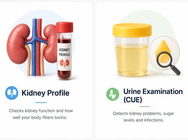 Kidney profile includes creatinine and other markers to check how well your kidneys are working and filtering waste.